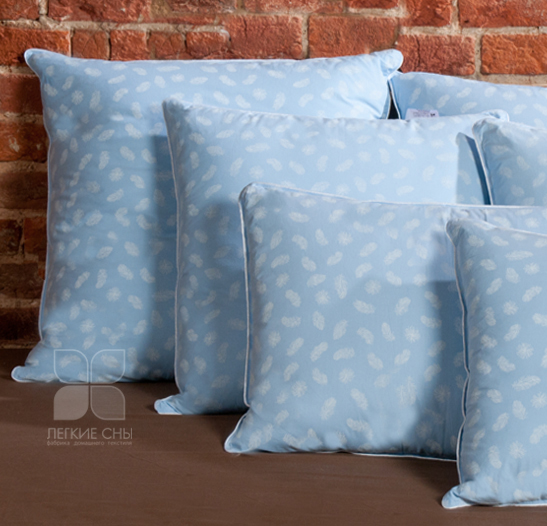 Наполнитель подушки из гусиного пуха с добавлением гусиного перышка 2 категории. Пух придает подушке мягкость и легкость, а перо добавляет объем и плотность. Подушка выполнена из пуходержащего хлопкового тика голубого цвета с рисунком в виде пёрышка, по краю подушки отделка белым кантом, фирменная упаковка конверт ПВД, спанбонд.