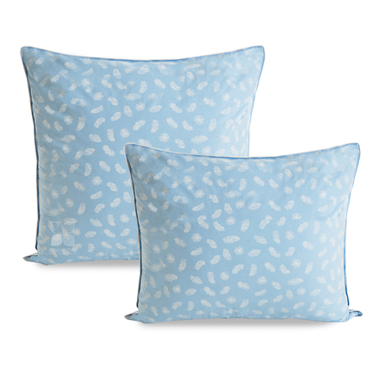 Наполнитель подушки из гусиного пуха с добавлением гусиного перышка 2 категории. Пух придает подушке мягкость и легкость, а перо добавляет объем и плотность. Подушка выполнена из пуходержащего хлопкового тика голубого цвета с рисунком в виде пёрышка, по краю подушки отделка белым кантом, фирменная упаковка конверт ПВД, спанбонд.